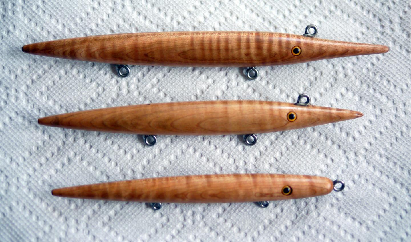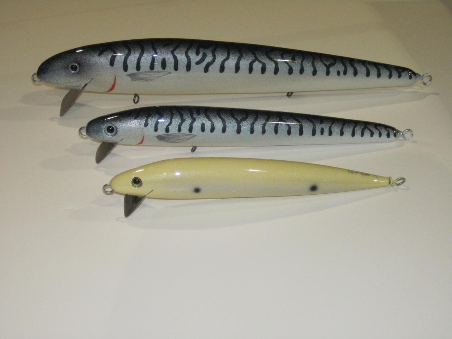 Handcarves are my new obsession! The yellow one is a 7" redfin copy, the middle one is an 8", I wanted a slightly larger plug, the 3rd one is 11" around 4 oz , the mackerel paint was done by Jmac, they look lifelike!