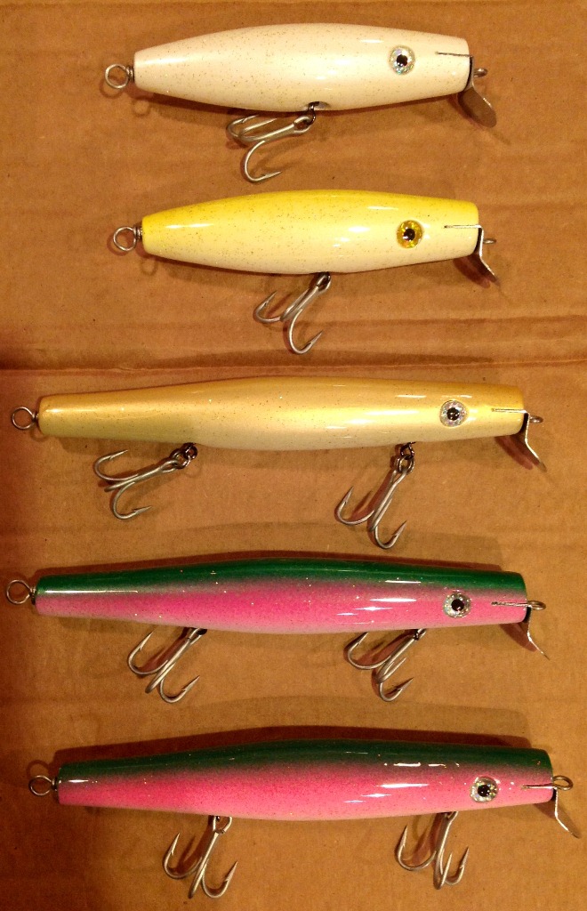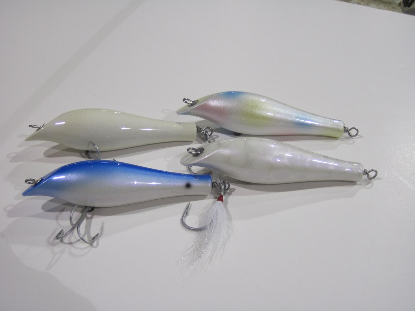 Man, there is some incredible work on this post. My wife keeps asking what I am going to do with all these plugs and I tell her that "he who dies with the most plugs wins." Then I show her this post, yep she just rolls her eyes. Here are the final ones painted and waiting for tails. Three 7" Sandeel swimmers and two 4.875 musso swimmers. I messed up on the white one and must have drilled it for a high slot lefty #1, so we will see how that one swims. May be a good twist, little deeper.