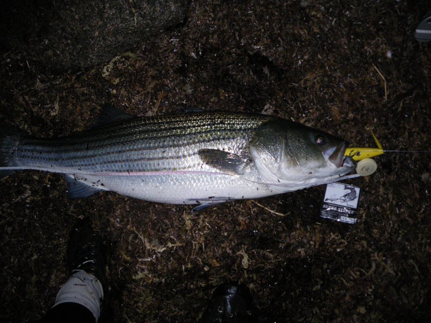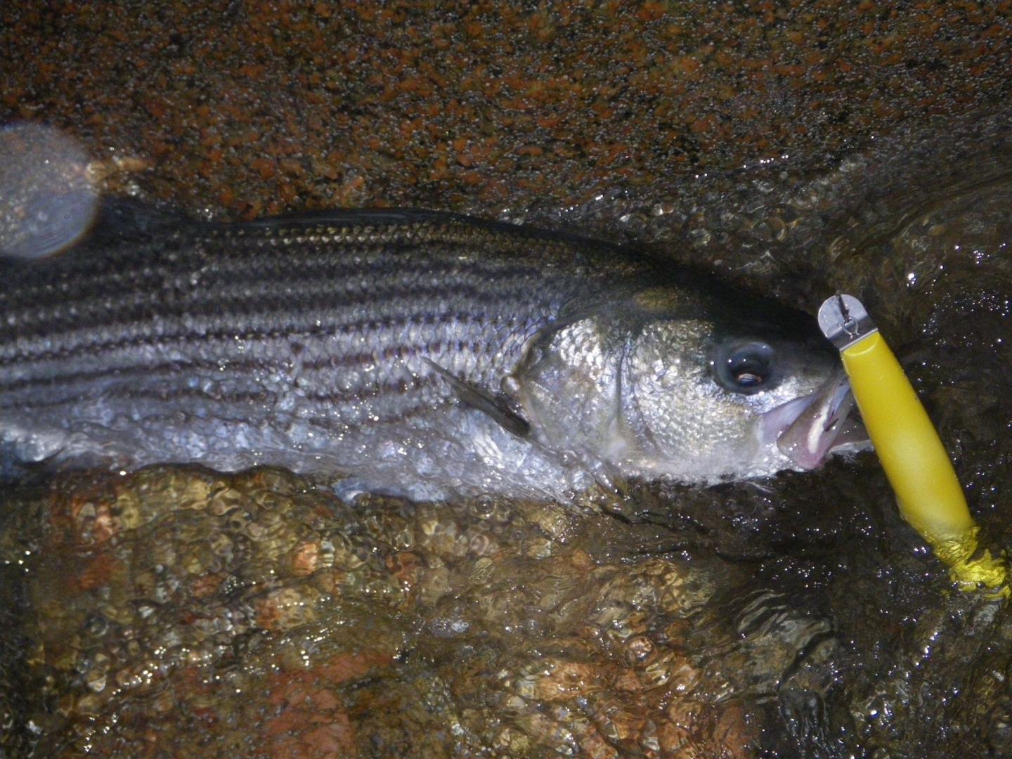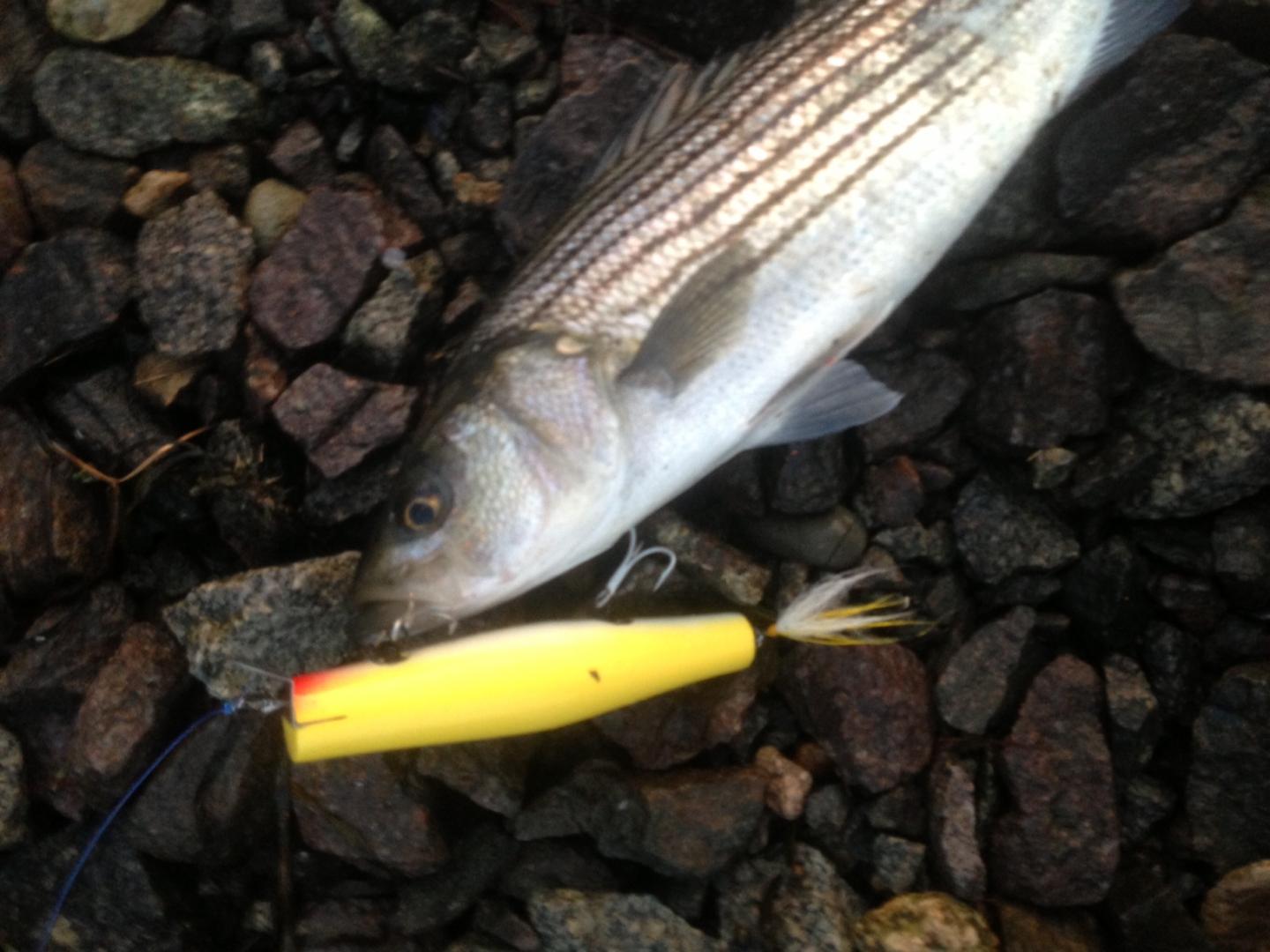 Got this low 20ish fish this morning on a 2.25oz skinny pencil in "great white" color scheme. Pic doesn't do the fish justice, but it went airborne several times during the shallow water battle and was a real pretty fish when it hit the rocks.