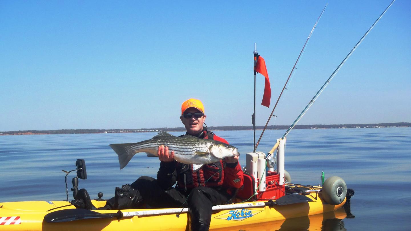 I love these posts every year, so good after a long winter and plug building to see the pictures of fish on new wood. I got this one about a month ago. Friend and i were fishing in a bay which seemed like the dead sea. Tide was absolutely not moving, water dead flat, no birds, lots of fishing boats not doing anything. After several hours we were makeing our way back to the launch when my friend said, that bird has been diving down in that spot for a while, there must be bait so let's troll by it. Bam, fish on... nice wake up call on this 36"er. The cool part is I had been playing around with this small swimmer at around 4.875" that you can see hanging in the back of the kayak next to the wheel.