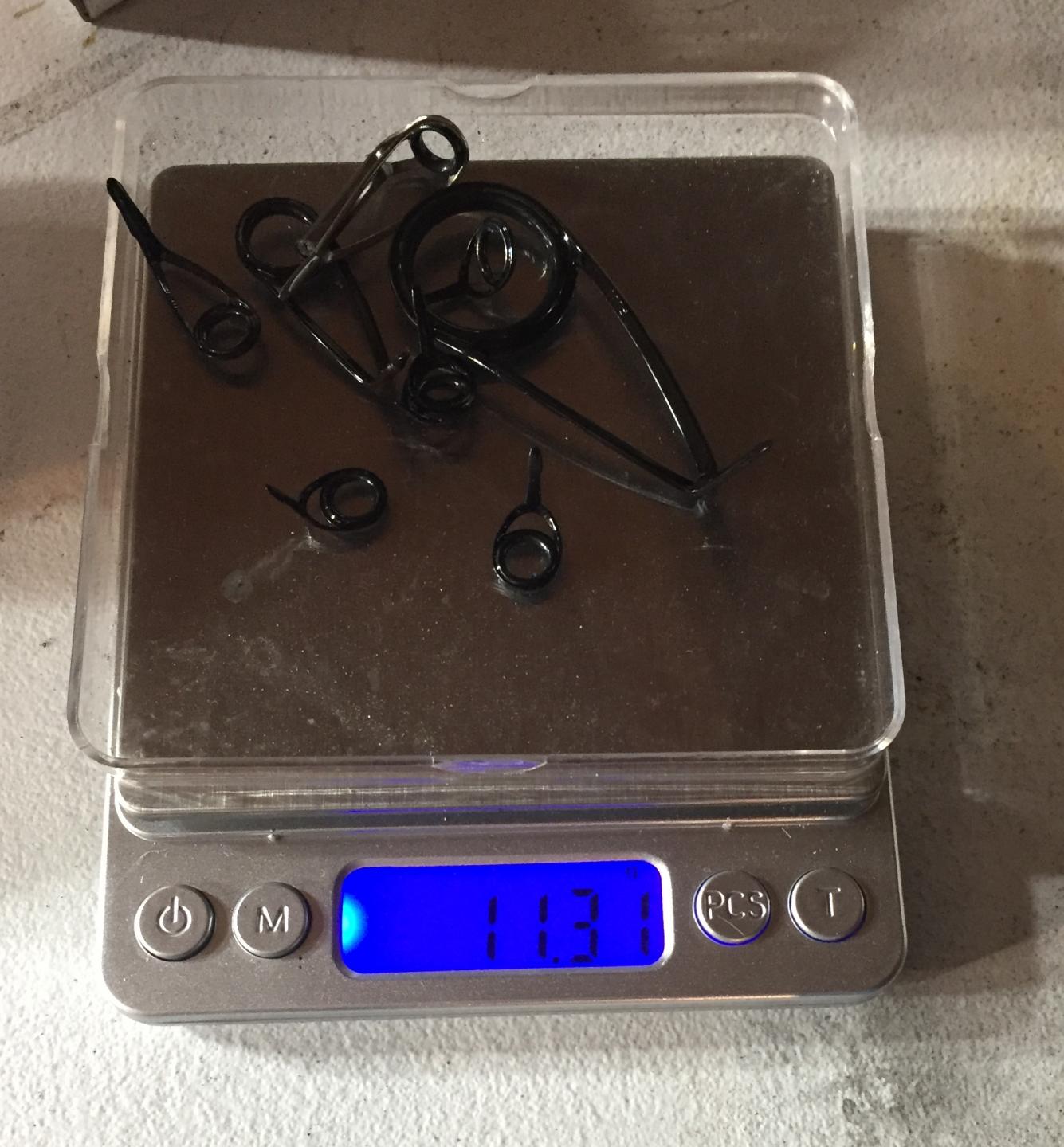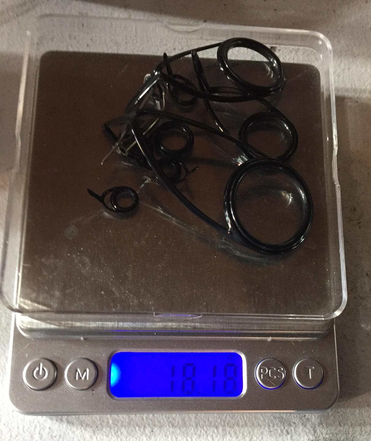 underwraps on tonight. i weighed the guides - the kl25-12-8m-8kt(5)-tip and the alternative, kw30-25-20-12-8(x4)-tip. pics are below. the kl set-up is 37% lighter vs the kw.