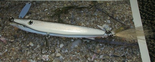 O.K. just finnished today. 3/4 by 3/4 hard pine. shaped an simple rattle can paint.silver under coat,white topcaot,an gold back an some over spray to blend in the sides 3/8 molded eye 1.5.ss screw eyes,a nice wide gap 2554ss tail hook,w/ tan deer hair. almost forgot OObuck shot in belly. one time deal think Ill HANG it.