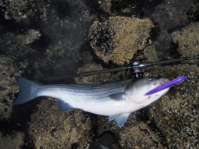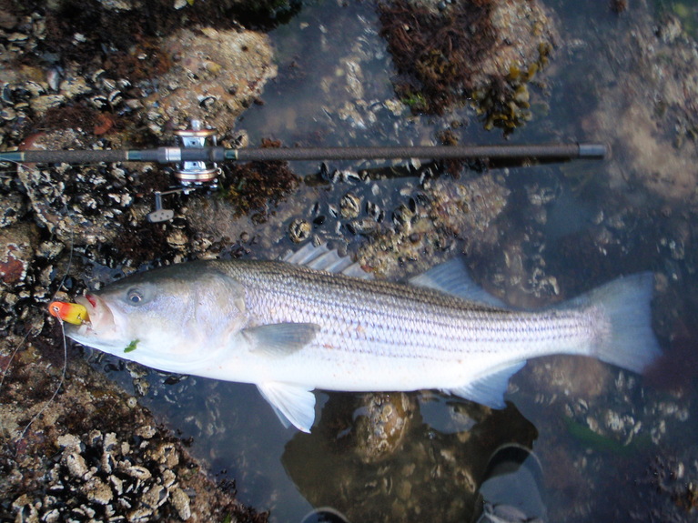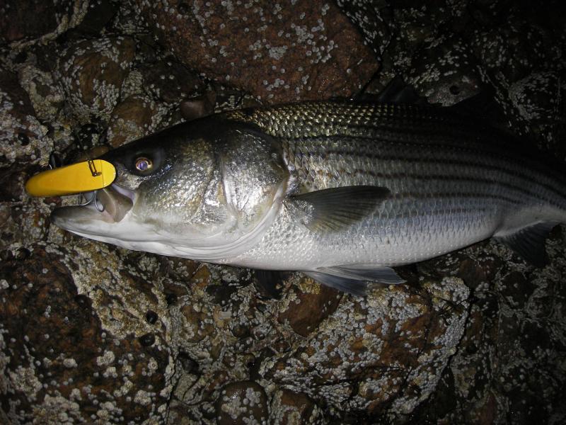 From last week. Taken on a DC custom 2.5 oz pencil. It was literally drawing fish to the surface while everything else was failing...no eels yet in 2009.....not sure how much longer I can hold out.....