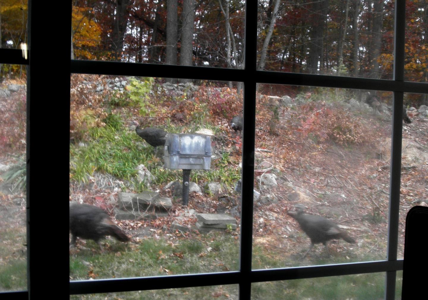 Flock of Wild Turkeys visited this morning. They just meandered through the back yard after coming out of the woods. I had a tough time getting pictures but here's what I got.