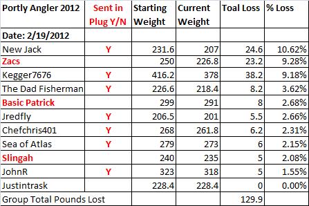 No change in standings New Jack and Kegger are doing great. Total weight loss for the Portly Angler team is 127 pounds. Lets see how quick we can get this over 200.