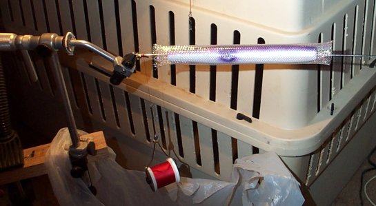 We’ll start with a needle that has already been turned, hook and eye holes drilled, primed, and painted. I’ve already added weight in the belly and have a hole drilled in the tail for a tail weight too. On this example, the tail hole is 5/16 inch and I’ll use a ¼ inch diameter slug. Note that only a very basic paint scheme is needed. In this example, I’ve done one with silver pearl belly and a pearl purple back/eyes. Also, note that the diameter of the needle right now is 0.73 inches and I have drilled out a slightly larger than usual hole for the nose grommet. The reasons for this will become clear shortly. The “hypnotic” part of the needle comes from a section of flex cord (available at many fly tying shops) that is wrapped around the needle. Here, I’m using a 3/8 inch diameter piece that is pearl color. Note that this diameter is less than that of the needle. This stuff stretches pretty well. The 3/8 inch can be forced over a plug with a diameter of 0.8 inches. Do them a little less than this to make it easier on yourself. The stuff I found at the local fly shop had a black thread down each side. A couple of careful snips with the scissors, a little pulling on the thread, and it was removed.
