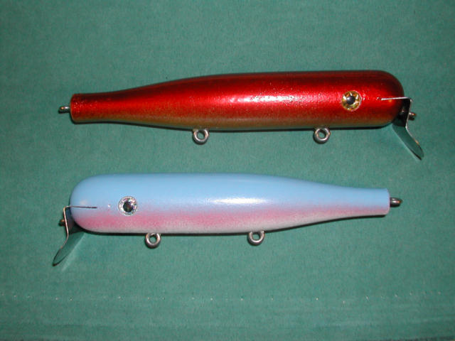 Here are a few atom jr. style guys I've squeezed in between the holiday parties.... They're all about 6" long, 1 1/8" diameter. These two have NJT#2 lefty lips, no weights. I'll be putting 2/0 VMC hooks on the belly and a big 5/0 EagleClaw 254 bucktail on the rear.