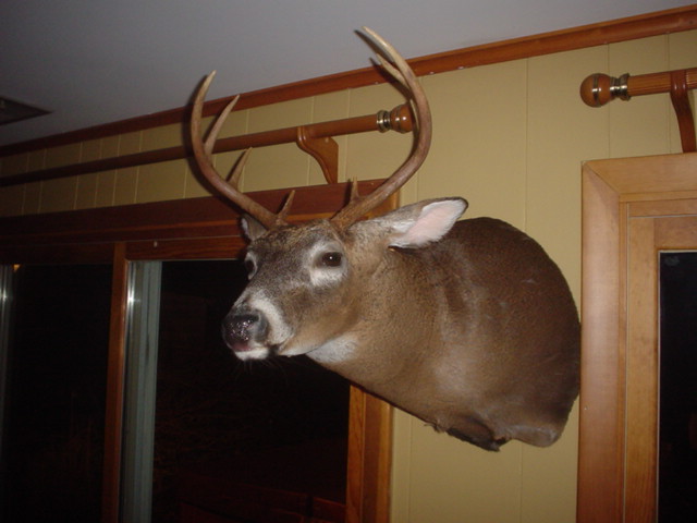 talk about full mount standing....you oughta check out the nice buck he has in his show room. Its a full mount, bucks lookin back over his shoulder, tail up......it's 15 yrs old and still looks good......he has it for sale at 400. thats what he paid for the mold.