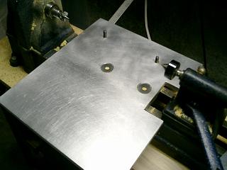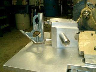 Bottom of tool holder. I used a piece of plastic to keep from having aluminum on aluminum which would gall up after a while. You need to use materials that will allow the holder to slide on the plate, yet not wear down. I also put 45 degree angles on the front of the holder for clearance so you can get closer to the work piece.
