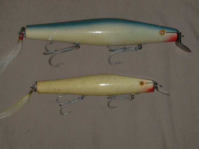 Here are two googoo eyes. Supposedly Cinto took a 73lb bass trolling one on wire. The biggest is 8 1/4"x 1 3/8" , the smaller 6 1/8" x 1 1/4". Yes, those are screw eyes. The line tie is central. I think they are pine. If they are weighted it must be in the nose since I cant see a weight hole in the belly.