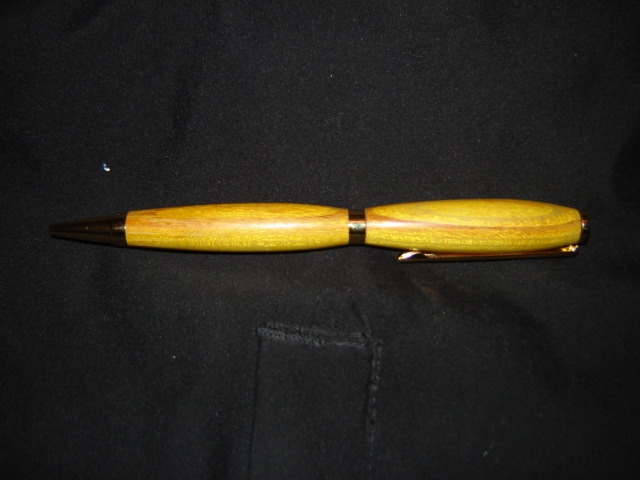 So Shannon and I have started expanding our lathe work to mix things up a bit. This is my first attempt at making a pen. It is turned form Osage Orange and I kind of like the "curve" aspect of the pen...if ya know what I mean Oh, I also eyeballed the centers on these really small blank for drilling