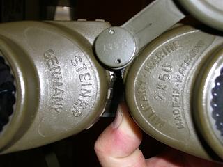 These are the Steiner 7 x 50 Military/Marine binoculars, covered in olive drab-colored rubber armor, excellent optics in both low and bright light, built-in lens and eyepiece covers, in great condition. $200 shipped.