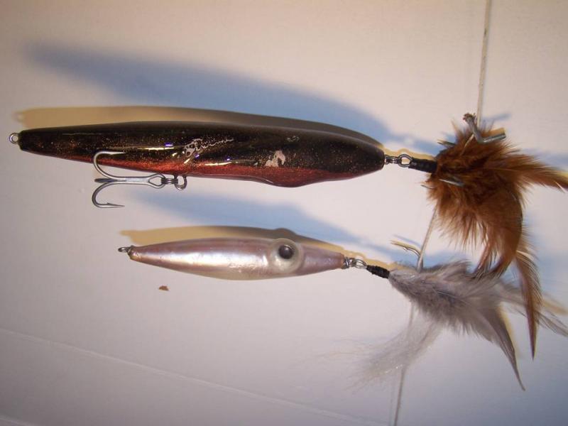 here's some new stuff, the lobster is 8" and close to 4 ounces to accomdate the large profile, the squid is heavily weighted for bouncing along the depths and the eel is fitted for skins...two fish on the lobster first night out so they appear to lke it, it's a bottom hugger...