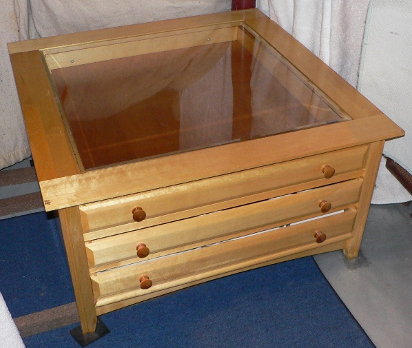 For Sale Square Hardwood Glass Top Curio / Chart Map Coffee Table With 3 Drawers