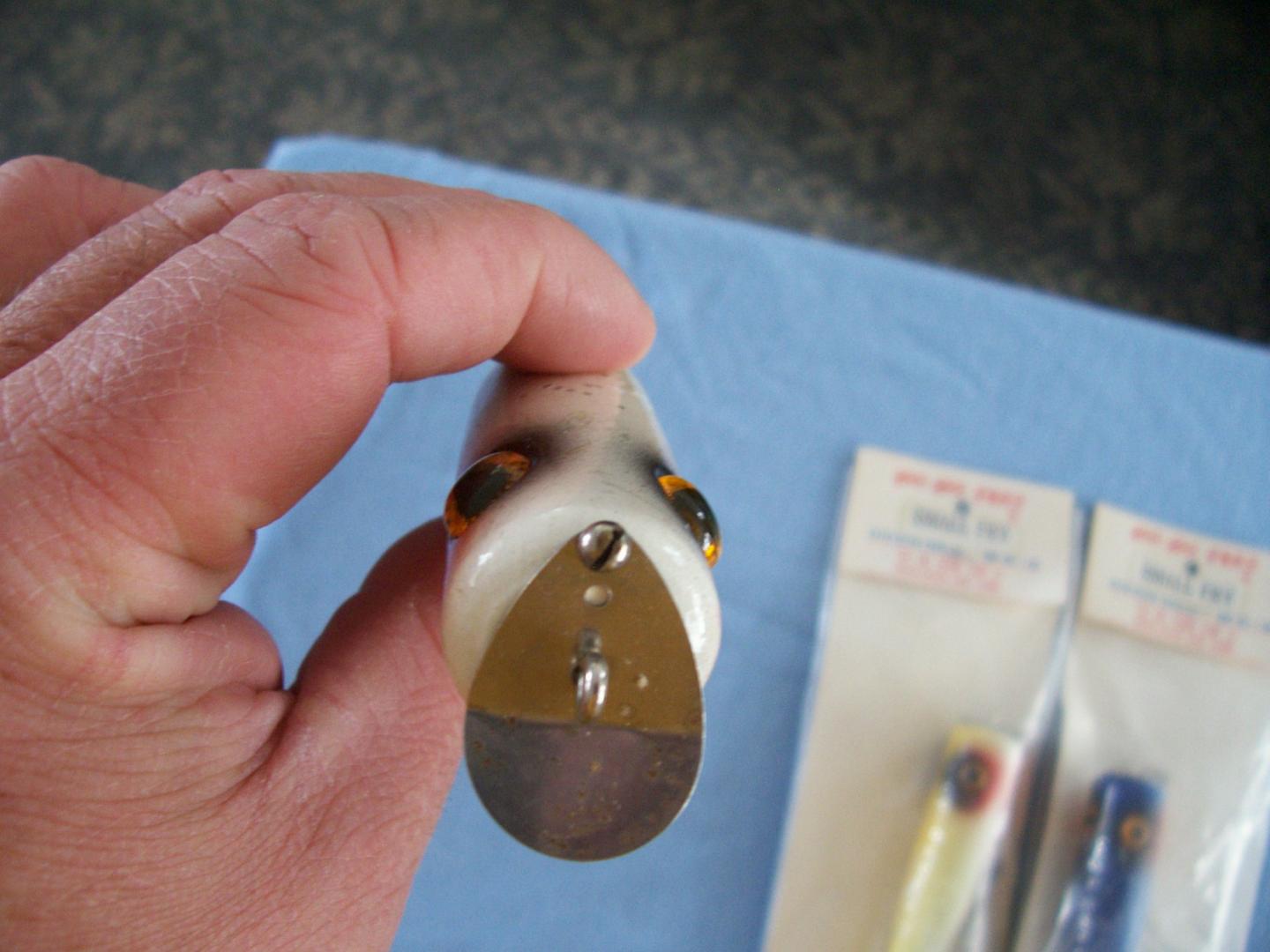 I make the eyes out of acrylic stock to the exact dim. of the originals. I also put a thru hole and a little counter bore in them so I can use a small ss nail to mount them. I like the clear acrylic as I can then paint the bottom of the eyes any color I want and the eye will take on that color. Time consuming but fun. Here are some I did several years ago. I really like making this plug but have not made any in a few years. I really need to make some more as they have all disappeared for some reason.