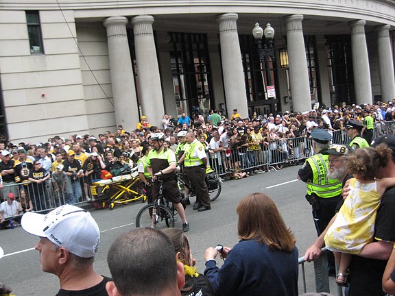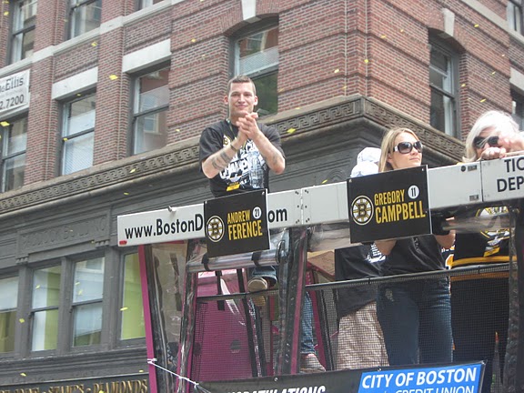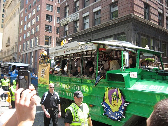 Around quarter to noon, 45 minutes after the start at the new Garden, the duck boats arrived. Of course, the whole Jacobs family was riding in the first one.