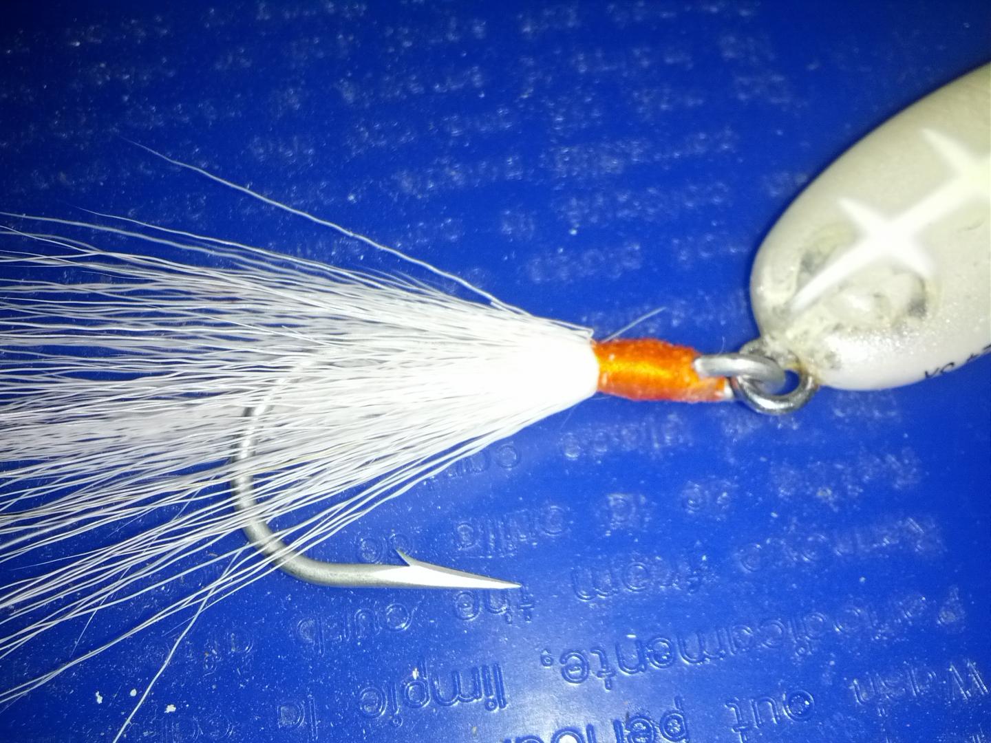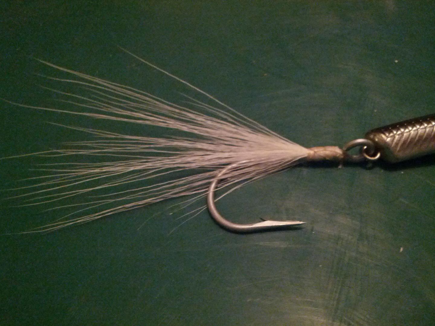 The blue/white one i tied last last fall when we had a sea herring run, the blue hair outfished all white everytime. On that jig in the pic its actually tied with white berkley braided line and super glue.